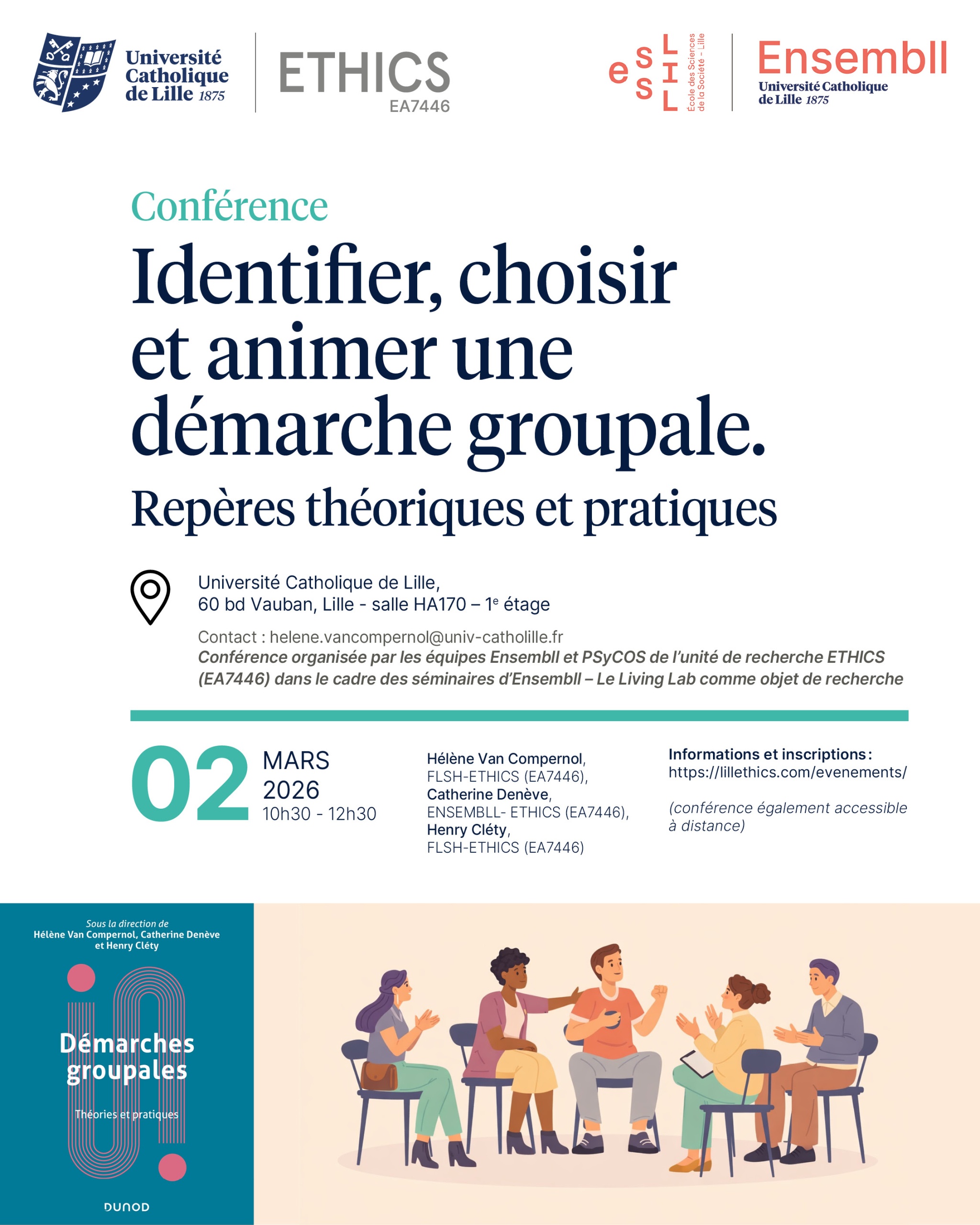 « Identifier, choisir et animer une démarche groupale. Repères théoriques et pratiques » Conférence organisée par les équipes Ensembll et PSyCOS de l’unité de recherche ETHICS (EA7446) accessible en présentiel ou à distance sous réseve d'inscription obligatoire dans le cadre des séminaires d’Ensembll – Le Living Lab comme objet de recherche  Intervenants : Hélène Van Compernol, FLSH-ETHICS […]