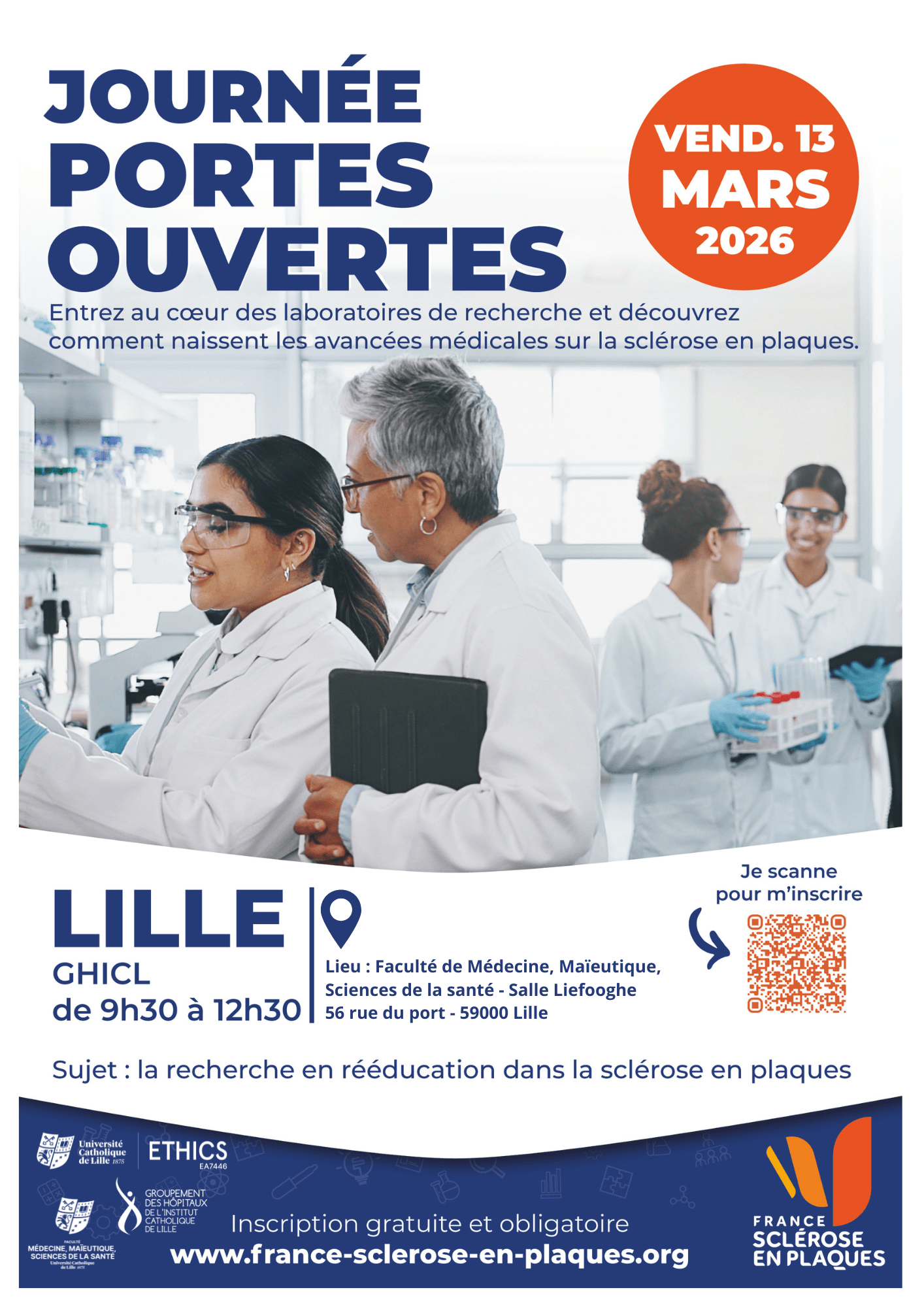 Journée Portes Ouvertes – Patients/Cliniciens/Chercheurs Lille 🗓 Vendredi 13 mars – matin 📍 FMMS – Salle Liefooghe Nous avons le plaisir de vous inviter à une journée portes ouvertes dédiée à la sclérose en plaques, organisée comme l’an dernier à la Faculté de Médecine et de Maïeutique Scientifique, Institut Catholique de Lille. 👉 Patients, aidants, proches et personnes sensibilisées sont les […]