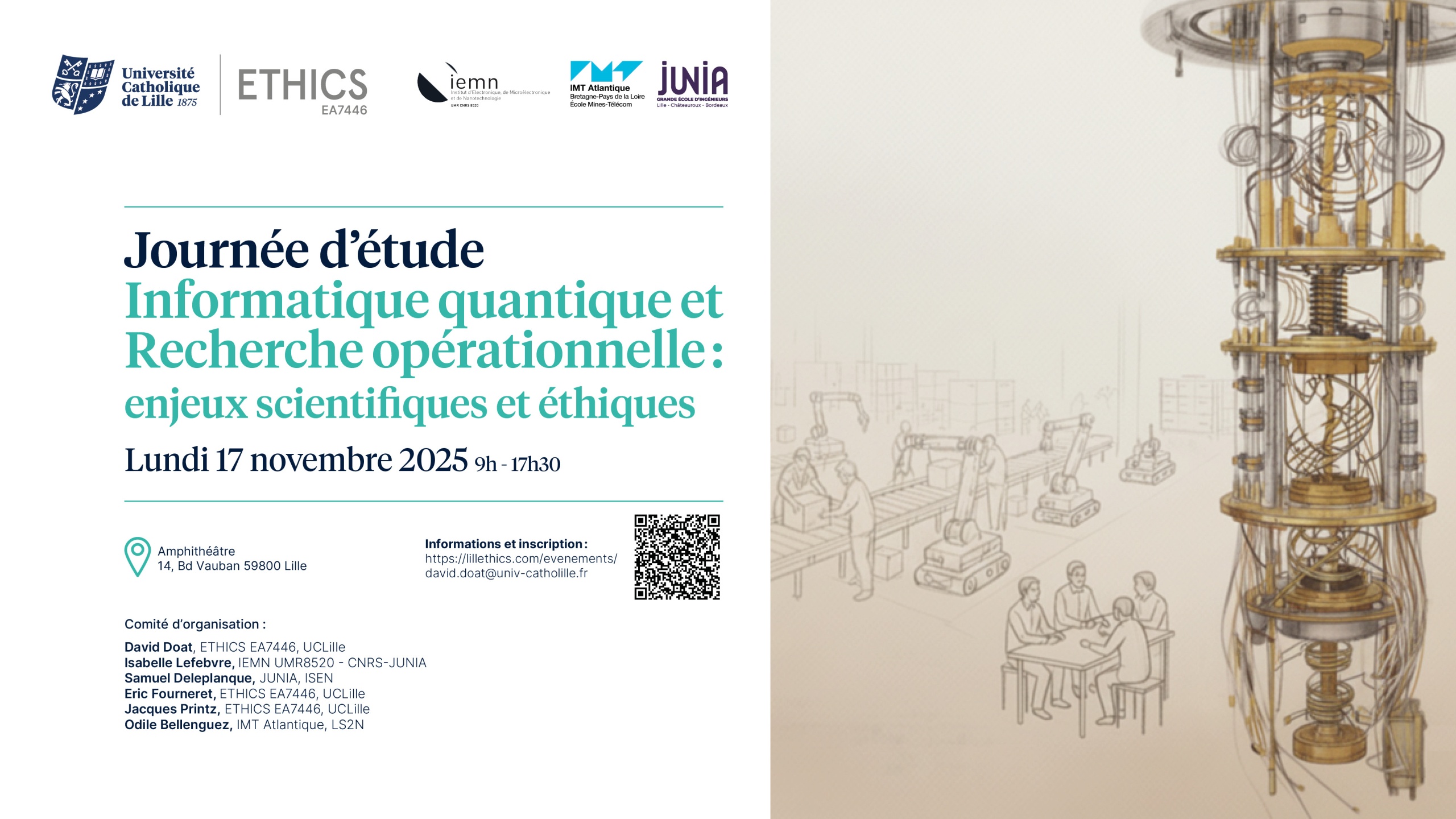 En plein développement ces dernières années, l’informatique quantique suscite intérêts et inquiétudes quant à ses applications possibles dans la société, tant en matière de cybersécurité que dans des domaines aussi divers que l’optimisation logistique, le traitement massif des données, la prise de décision automatisée, etc. Cette journée d’étude propose d’explorer un champ de questions à la frontière de l’éthique, de la Recherche Opérationnelle (optimisation des pratiques et des procédures dans les organisations humaines à l’aide de l’informatique) et du champ émergent de l’informatique quantique, qui intéressent particulièrement « la question de la vie bonne, avec et pour autrui, dans des institutions justes » (Paul Ricoeur). Deux champs de questions seront explorés dans le but d’en dégager des conclusions temporaires.