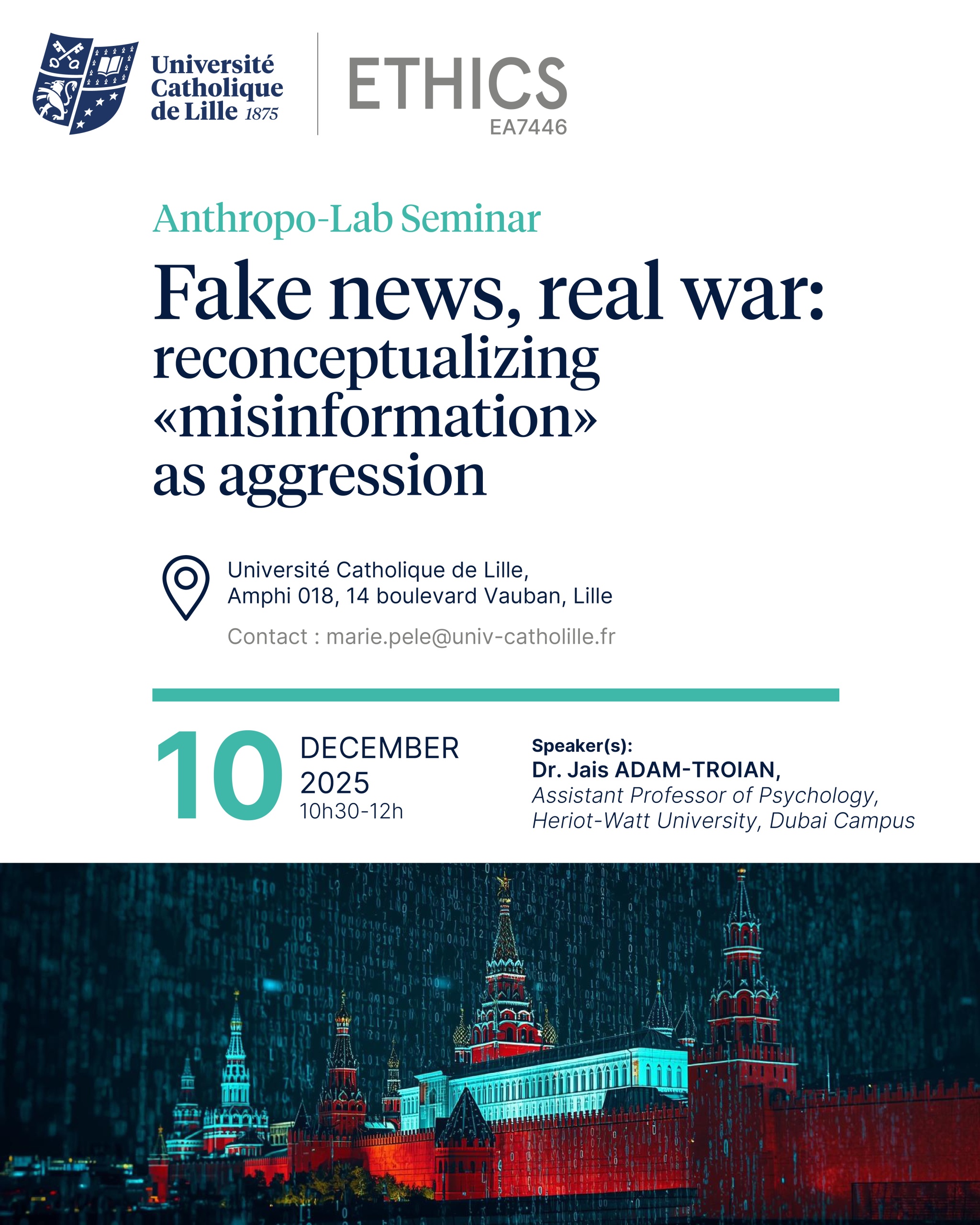 Contact et inscription : marie.pele@univ-catholille.fr SUMMARY OF YOUR PRESENTATION Misinformation has become a core issue for social and political psychologists over the past decade. So far, misinformation has been mostly studied under the lenses of a “cognitive paradigm”, focusing on the vulnerabilities of those who believe it and proposing interventions targeted at the individual-level. While […]
