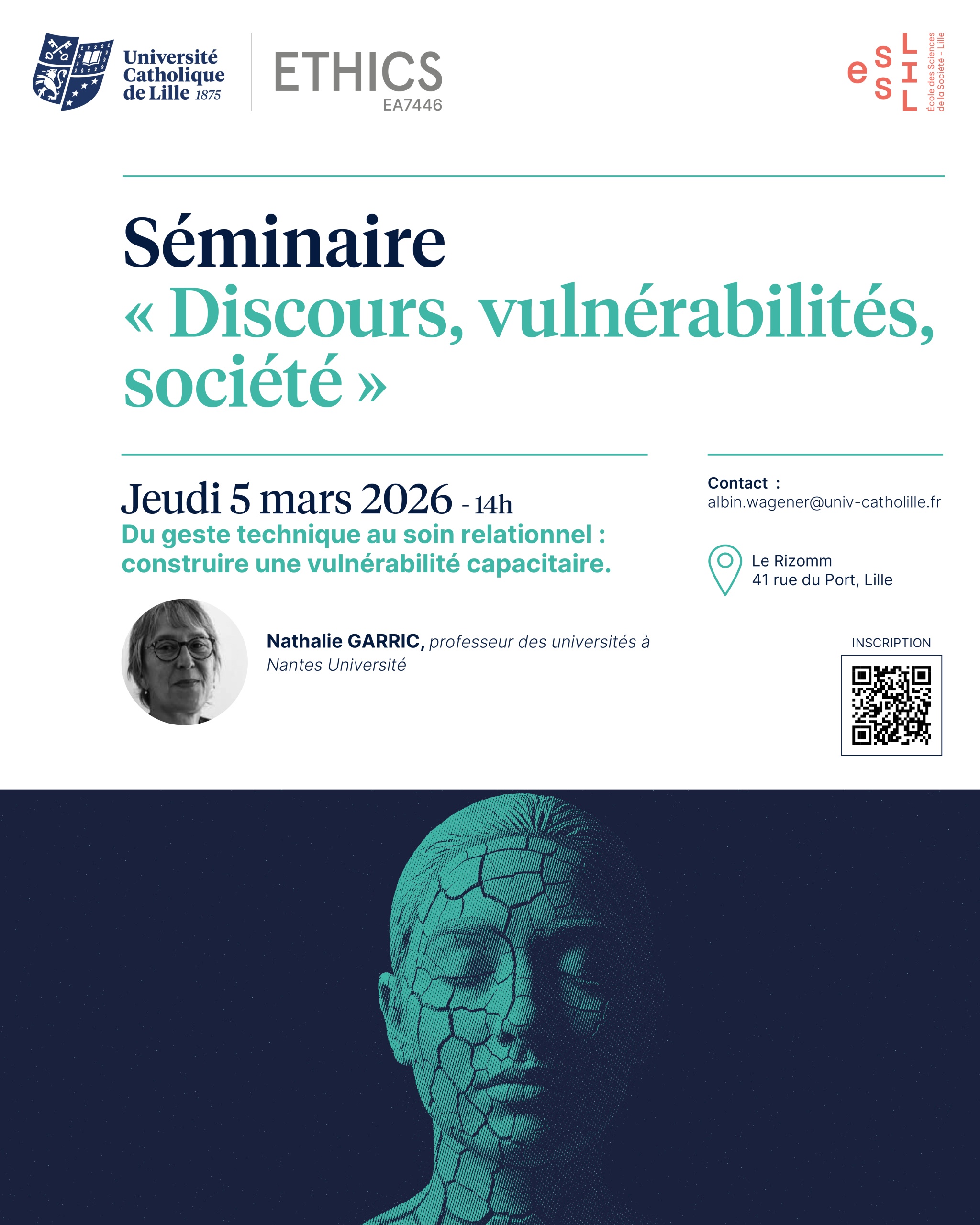 Séminaire annuel  "Discours, vulnérabilités, société" Séance 4 "Du geste technique au soin relationnel : construire une vulnérabilité capacitaire" en présence de Nathalie GARRIC Lieu de l'événement : Université Catholique de Lille, […]