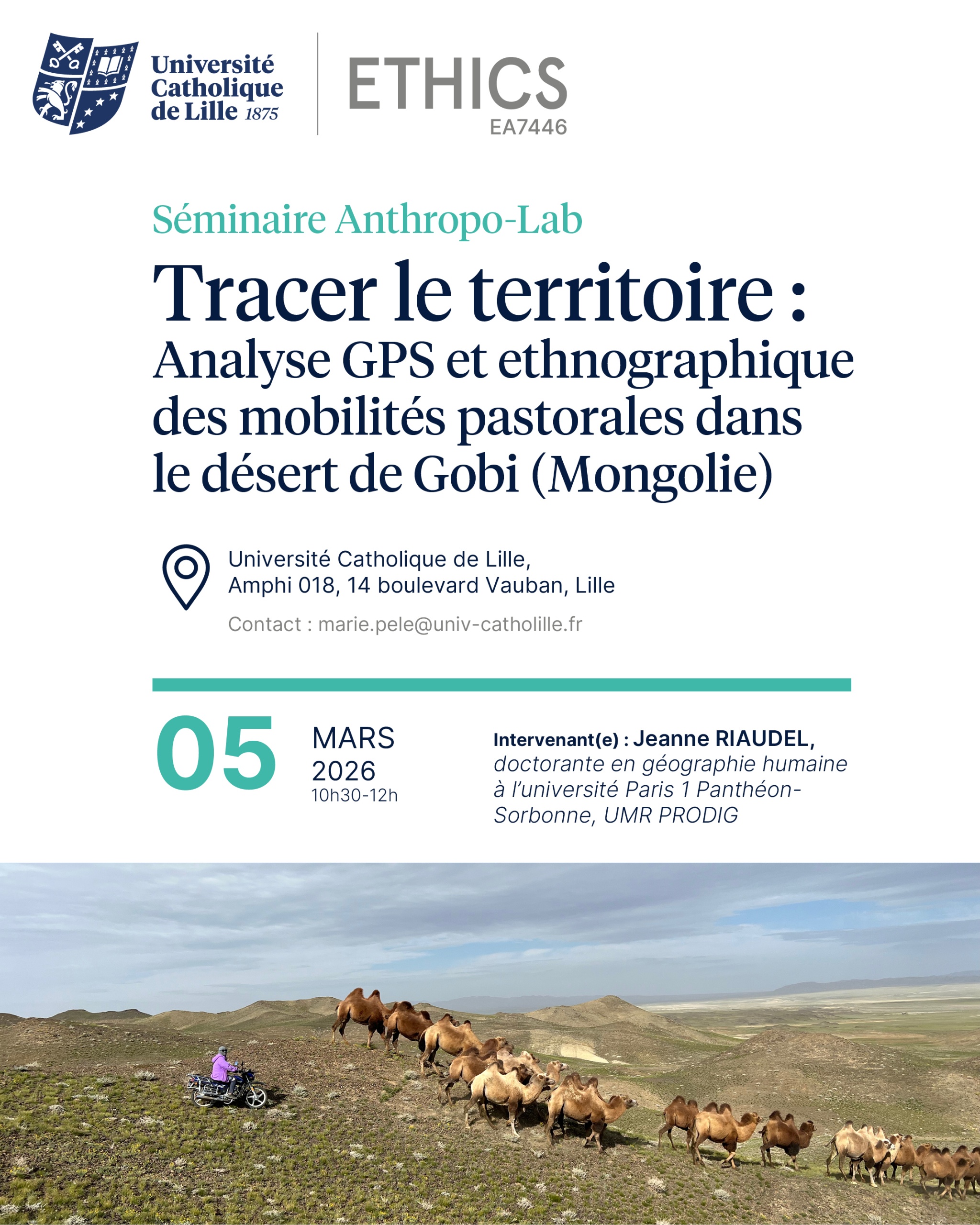 Contact et inscription : marie.pele@univ-catholille.fr Biographie  Jeanne RIAUDEL, doctorante en géographie humaine à l’université Paris 1 Panthéon-Sorbonne, UMR PRODIG Doctorante contractuelle en géographie depuis 2023, je travaille sur les mobilités pastorales humaines et animales dans le désert de Gobi mongol (sud de la province de Bayanhongor et nord-est de celle du Dornogobi). Depuis 2022 […]