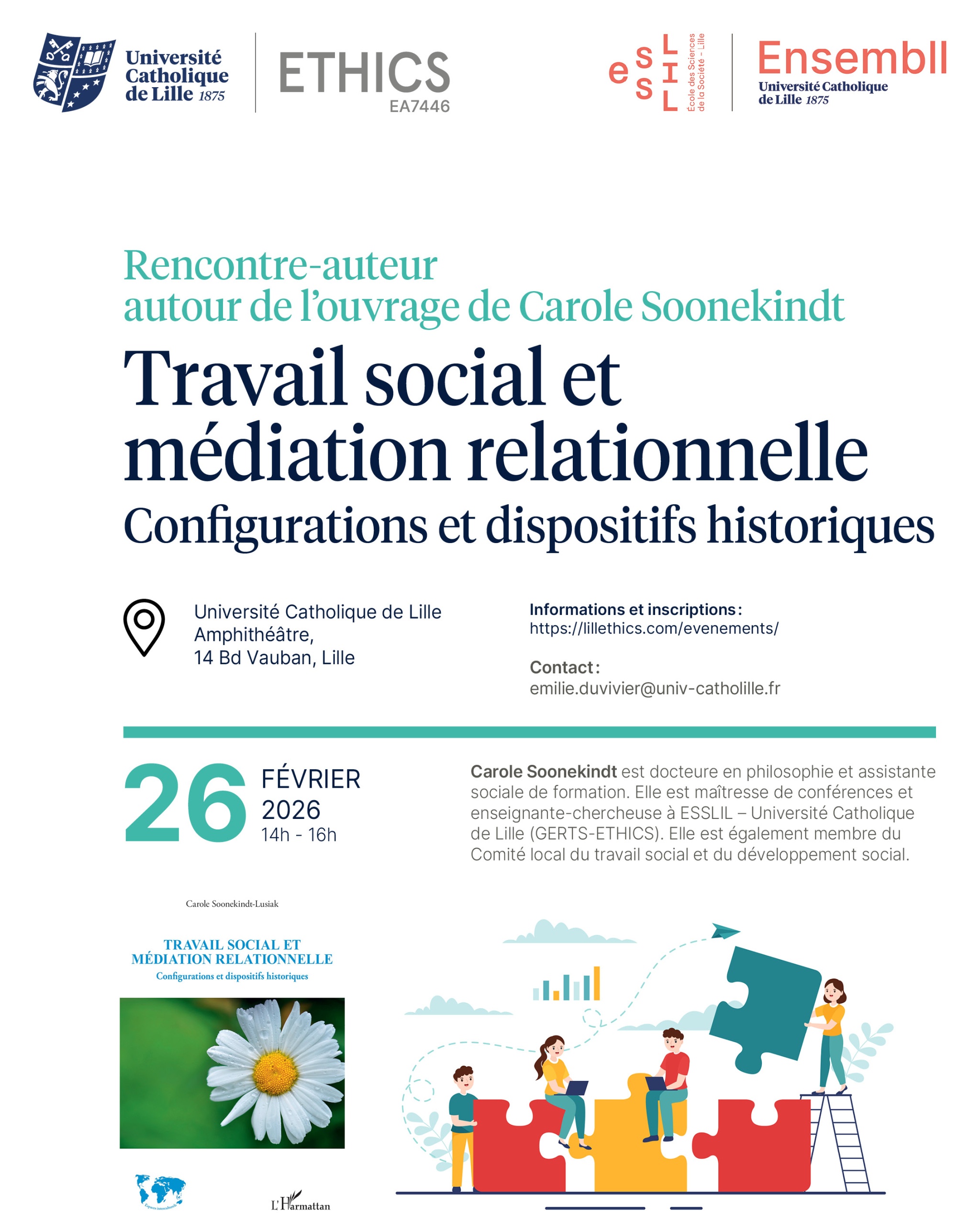 Rencontre-auteur autour de l’ouvrage de Carole Soonekindt TRAVAIL SOCIAL ET MEDIATION RELATIONNELLE. Configurations et dispositifs historiques. Date : Jeudi 26 février, de 14h à 16h Lieu : Université Catholique de Lille, amphithéâtre, 14 Bd Vauban, Lille Contact : emilie.duvivier@univ-catholille.fr Carole Soonekindt est docteure en philosophie et assistante sociale de formation. Elle est maîtresse de conférences […]